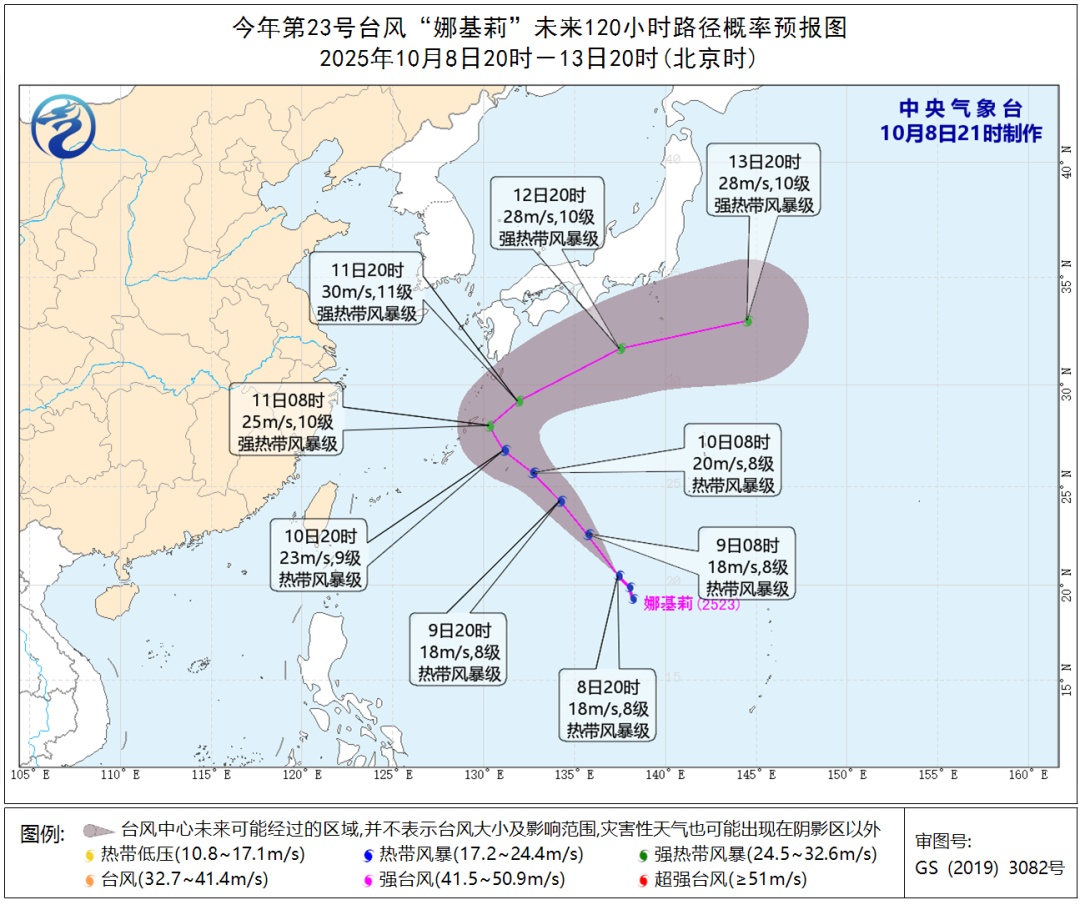 预计“娜基莉”将以每小时25-30公里的速度向北偏西方向移动,强度缓慢增强。
