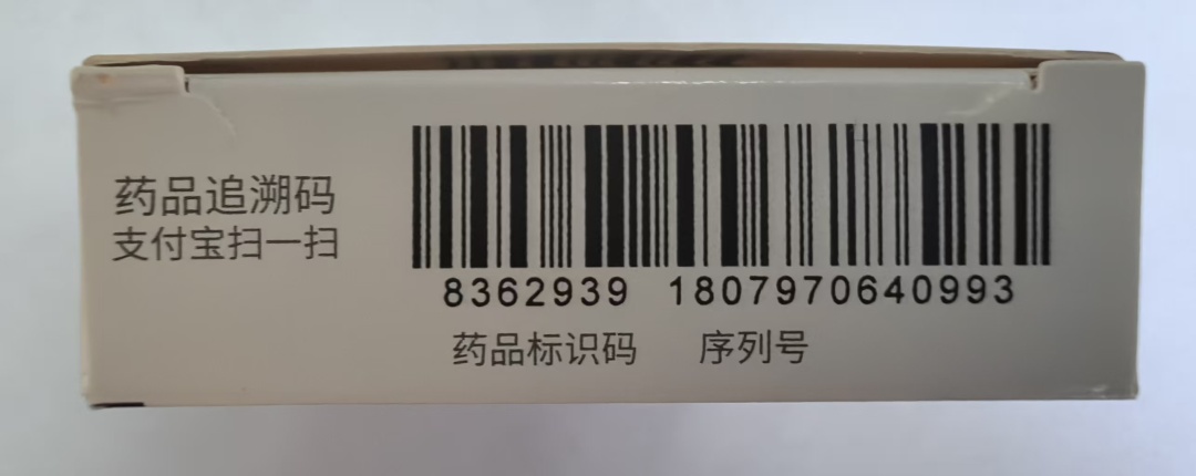 在药品包装盒上有一个条形码和一行数字/字母组成的编码,旁边可能标注着“追溯码”“药品追溯码”或“中国药品电子监管码”。