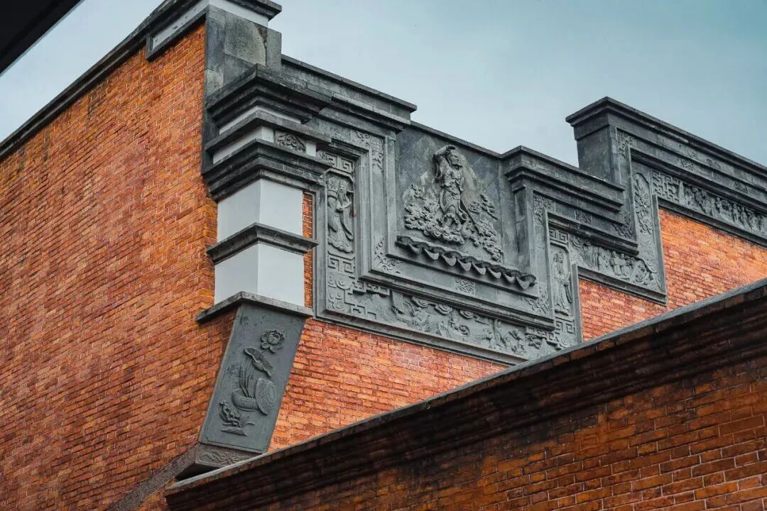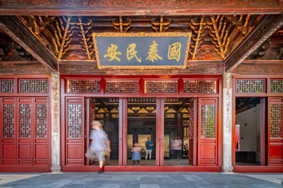 从格局到细节,处处透着浓浓的闽南建筑风格:门楼高约12.5米,气派不已。门额周边环绕着双龙戏珠、历史人物等各种精美浮雕,墙体两侧则分别雕刻着千里眼、顺风耳、万民朝圣等图像。
