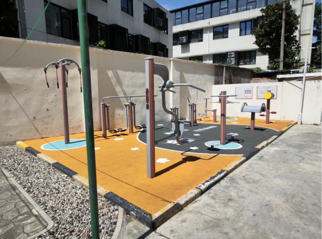 短短一周过去了,健身苑点彻底变了样。阳光下,9件崭新的器材亮闪闪,原本斑驳的水泥地换成了塑胶地面,踩上去弹性十足,雨天也不用担心滑倒。居民们路过时都忍不住停下脚步,不少人当场试用起新器材。