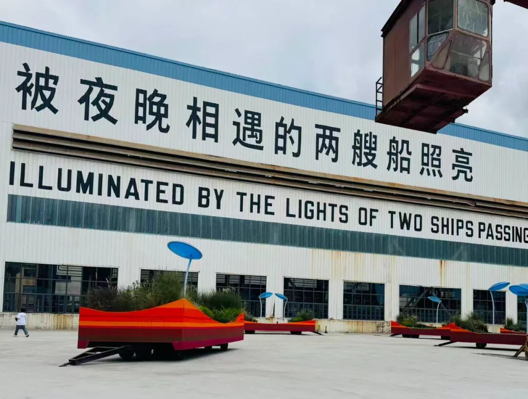 傍晚时分,潮水渐涨,江风拂过船台公园的草坪。“被夜晚相遇的两艘船照亮”的巨字在暮色中微微发亮,像是在诉说着小岛的故事:曾经被时光遗忘的它,如今正以艺术为帆、科技为桨,让过去与未来像夜色中交汇的船,彼此照亮。