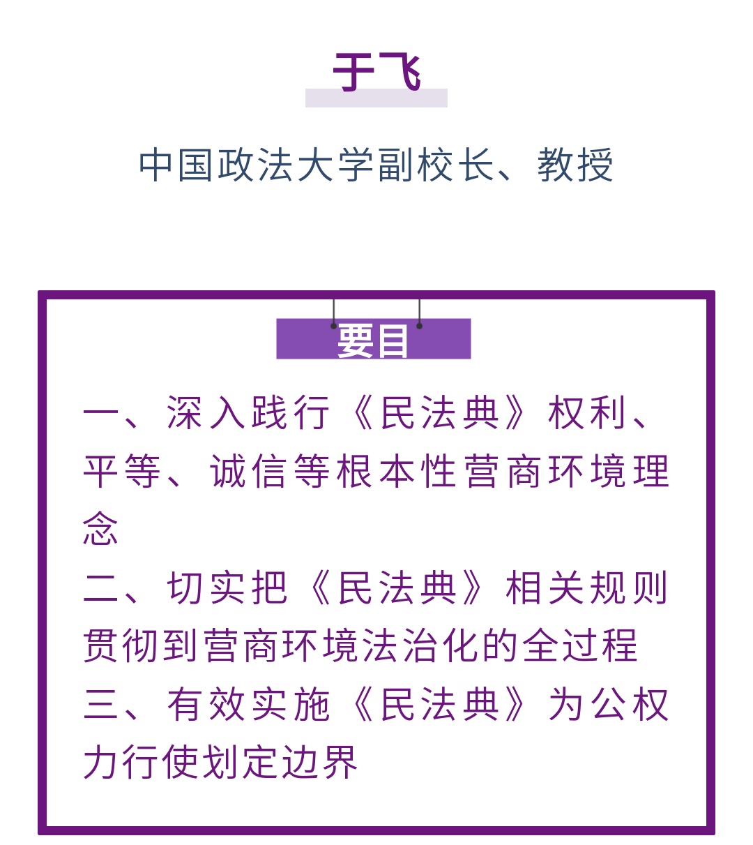 法治是最好的营商环境。《民法典》在中国特色社会主义法律体系中具有重要地位,是一部固根本、稳预期、利长远的基本法律,同时也被称为社会主义市场经济的基本法。贯彻实施好《民法典》,本身就是营商环境法治化的题中应有之义。今年是《民法典》颁布五周年,当前以及今后很长一段时间都需要我们把《民法典》的基本理念和制度规范不折不扣地落实到营商环境建设的每一个环节,持续释放《民法典》在产权保护、合同严守、诚信经营、公平交易、平等保护等方面的强大效应,持续不断为营商环境注入民法动能。以下我将从《民法典》的基本理念、《民法典》的规则实施以及《民法典》与公权力的关系三方面展开汇报。一、深入践行《民法典》权利、平等、诚信等根本性营商环境理念《民法典》第一章就规定了合法权益受保护、平等、诚信等基本原则和基本理念,这跟营商环境所要求的权利、平等、守信等精神有天然的契合性。《民法典》所确立的基本原则和基本理念为法治化营商环境奠定了思想根基和理念基础,践行好《民法典》的基本理念,就是为营商环境法治化打好最坚实的地基。《民法典》第3条规定了合法权益受保护原则,营商环境最核心的一点就是要保护市场主体的合法利益,市场主体在市场竞争中所获得的利益不能被任意侵害或剥夺,这是市场经济中最根本的激励机制,要承认个体利益的正当性合理性。《民法典》第4条规定民事主体的法律地位一律平等,第133条规定民事主体财产受法律保护,保障一切民事主体平等法律地位和发展权利。按照平等原则,公有制和非公有制企业、内外资企业都需要平等对待。重在打破身份壁垒,消除各种隐性的壁垒,这是起点的平等,是准入的平等,是地位的平等。任何主体都不能被排斥在规则之外,同时也不能超越规则享受法外特权,该理念从根本上确立了权利平等、机会平等和规则平等的制度框架。《民法典》第5条规定自愿原则,民事主体应当遵循自愿原则,依权利主体的意思设立、变更、中止民事法律关系。充分保障各类市场主体的选择自由、行为自由、追求正常个体利益的自由,充分调动市场主体的能动性和积极性。诚信是营商环境的基石,市场经济是信用经济,完善的信用社会体系是良好营商环境的重要组成部分,《民法典》第7条规定诚信原则,诚信原则被称为民法的帝王条款,要求各类市场主体在市场经济活动中守信重诺,遵守商业道德履行合同,积极弘扬社会主义核心价值观,不得欺诈、违约和恶意竞争。以上这些《民法典》的基本原则和基本理念,影响着并渗透在每一条民法规则的解释和适用当中。当具体条款规则存在含义不明确存在理解歧义时,基本原则和理念就是解释基准。当适用法律找不到具体规定或出现法律漏洞时,法官裁判可以从基本原则推导产生体现这种基本原则基本价值的替补规则作为个案规范,填补法律漏洞,进而进行裁判。这就是基本原则和理念的补充功能。此外,具体规则在适用时产生严重的不妥当后果,基本原则还能发挥修正功能。可见,法官司法时,找到可适用的规则,基本原则可能发挥解释功能;找不到具体可适用的规则,基本原则可能发挥补充功能;找到具体规则而不能用,基本原则可能会发挥修正功能。《民法典》的基本原则和基本理念与营商环境的理念息息相关,已经渗透到《民法典》每一条规则的适用和漏洞补充作业当中。二、切实把《民法典》相关规则贯彻到营商环境法治化的全过程如果把《民法典》的基本理念喻为营商环境法治化的地基,《民法典》的基本规则就是构成营商环境法治化的四梁八柱。《民法典》将民商事法律规则以《民法典》的方式呈现出来,内容涉及产权归属、要素配置、交易流转、权益保护等市场经济发展全流程的法律规范。这些规则丰富完善了市场化法治化营商环境的制度供给。从这个意义上说,把《民法典》的相关规则实施到位,营商环境法治化的主体框架就基本确定了。