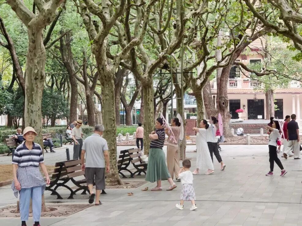 申城今日天色灰蒙,厚重的云层遮蔽了阳光的照射。上午十点,徐家汇公园内人头攒动,阿姨们结伴在公园的空地上舞蹈健身,不少家长推着幼儿车在公园步道上遛娃散心。