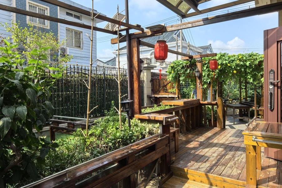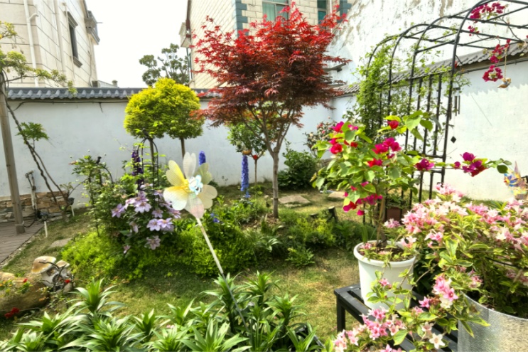 推开院门,红枫似火、紫藤蜿蜒,风过时枝叶簌簌如自然乐章。在“一房一藤蔓”指引下,王先生巧借垂直空间搭配植物,让小院景致和谐丰富。鱼池旁、假山边设休闲区,可与家人饮茶闲聊赏景;废旧物品被改造成园艺装饰,既环保又添趣味。