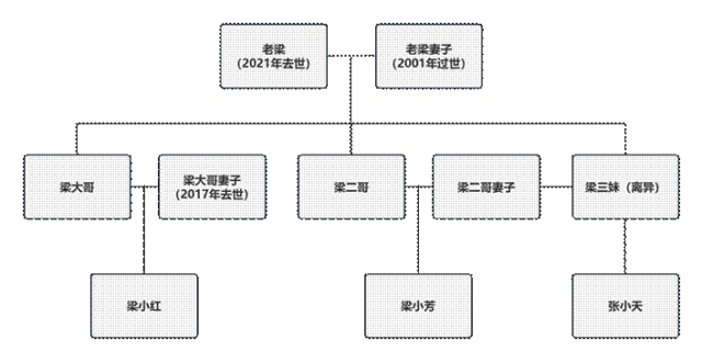 2021年,老梁去世,生前未立遗嘱。老梁名下还有一套房子,老梁占2%,两个孙女各占49%。就这套房子的继承问题,梁家兄妹三人有不同的意见。梁三妹这才发现,当年老梁家获得的补偿款和安置房并非按照人均比例分配。