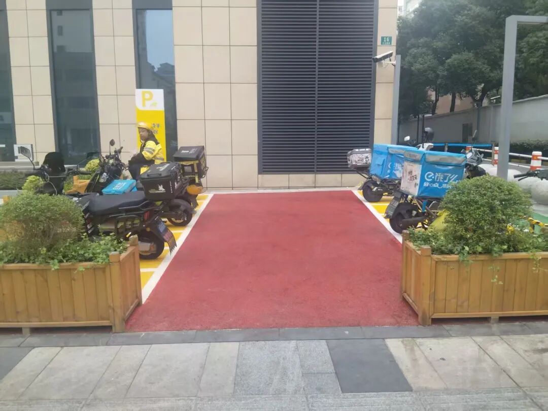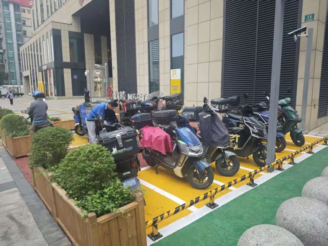 针对“空间不足”的核心痛点,治理团队从“增量供给”与“存量优化”双管齐下。经与玖时商场协商,在商场红线范围内挖掘潜力,于东北侧增设非机动车停车场,并专门设置外卖骑手专用“潮汐车位”——既满足骑手“距离近、取餐快”的效率需求,又避免与其他车辆抢空间。同时,重新优化大木桥路沿线停放布局,划分外卖车、共享单车、社会车辆专属区域,最大程度释放停车空间,真正实现“还路于民”。