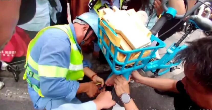 “慢点,别动,你疼了告诉我。”民警一边安慰女孩,一边尝试为其解困。然而,女孩的脚卡得太紧,徒手根本无法拔出。民警向周边便利店和路人求助,但始终没有借到合适的工具。恰巧此时有位热心的环卫师傅路过。