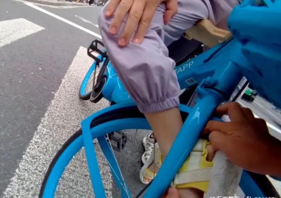 为贪图方便,家长竟违规在共享单车上加装“载娃神器”,导致10岁女儿脚部被卡进自行车前轮。近日,徐汇交警在日常巡逻中及时发现并处置一起险情,所幸救助及时,女孩并无大碍。