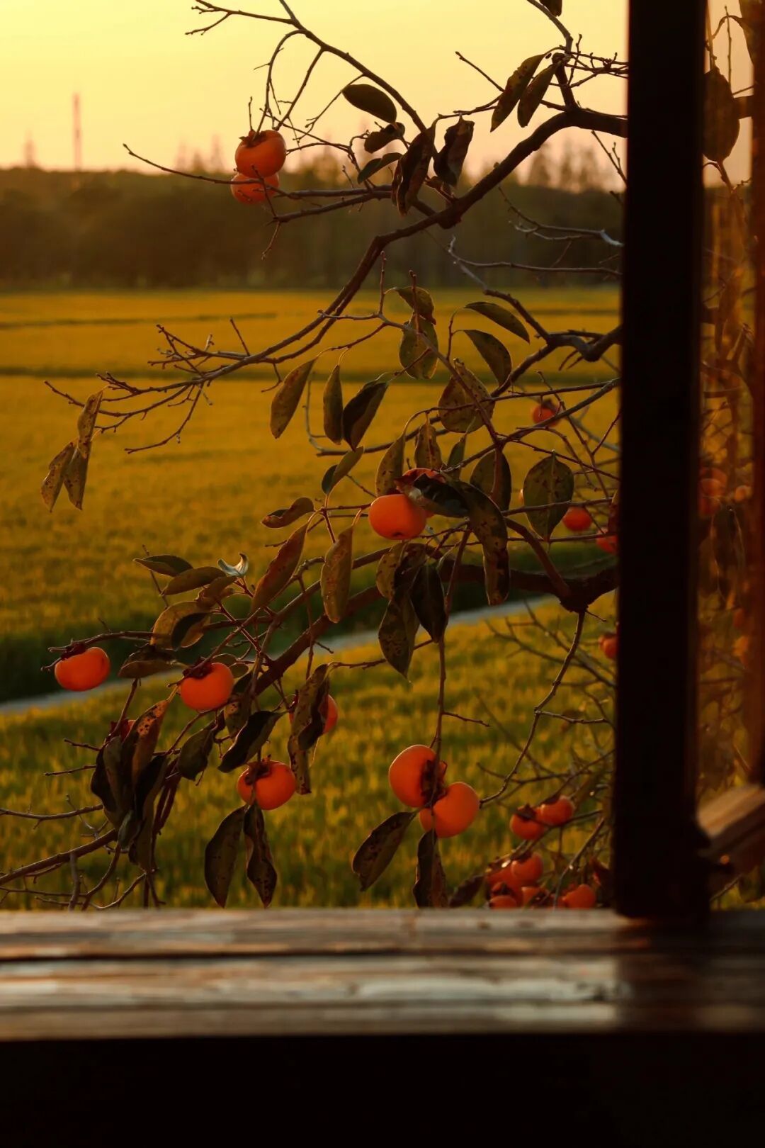 特色:柿子树与金色稻田同框,远处是典型的江南民居,层次分明;