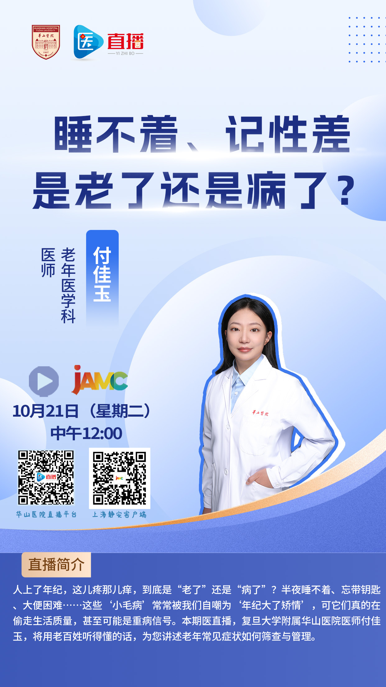 人上了年纪,这儿疼那儿痒,到底是“老了”还是“病了”?半夜睡不着、忘带钥匙、大便困难……这些‘小毛病’常常被我们自嘲为‘年纪大了矫情’,可它们真的在偷走生活质量,甚至可能是重病信号。本期医直播,复旦大学附属华山医院医师付佳玉,将用老百姓听得懂的话,为您讲述老年常见症状如何筛查与管理。