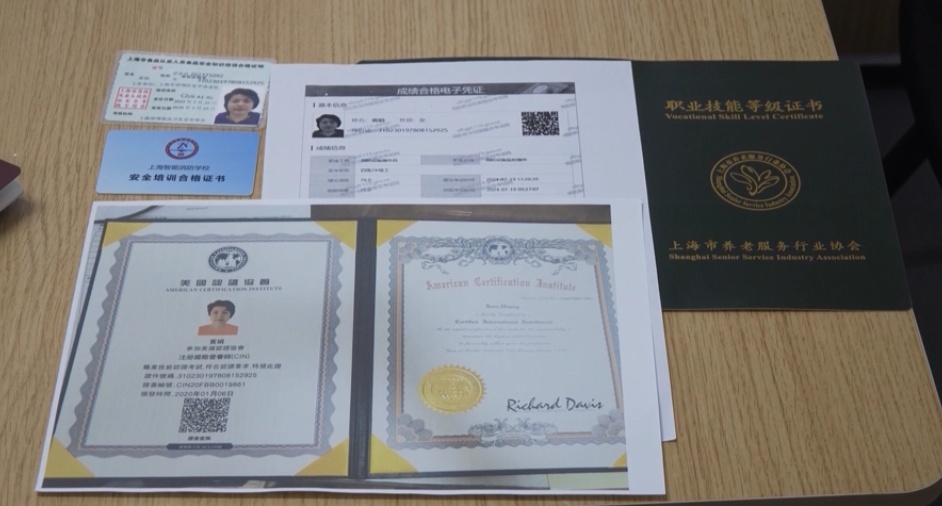 在养老行业工作多年,黄娟始终没有停止学习。她不仅是高级护理员,还取得了陪诊师、食品安全管理员、消防设施操作员等多项资质。“仅仅掌握照护技术是远远不够的,医疗常识、营养学知识等都要持续学习。生活照料只是基础。”