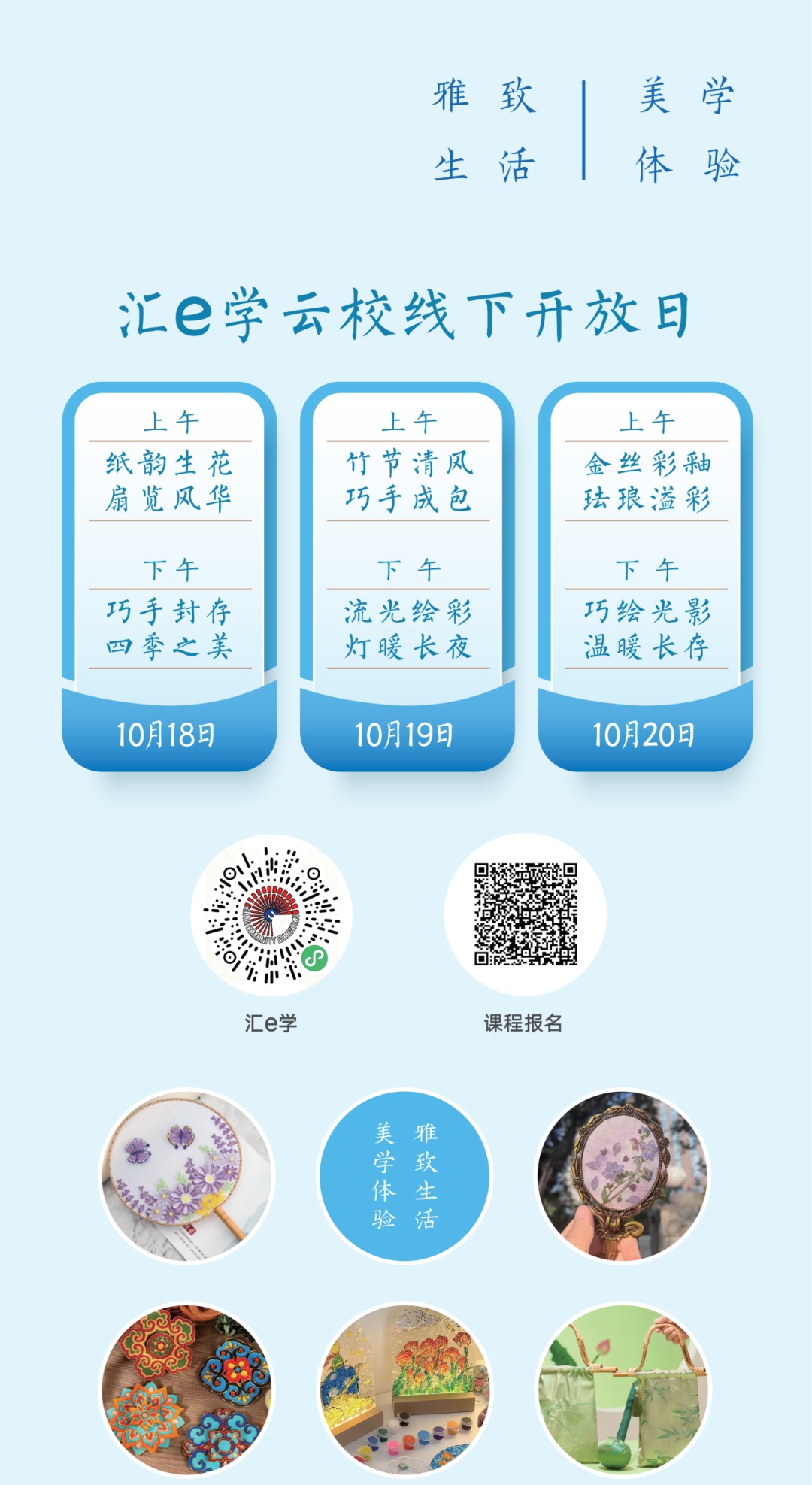 徐汇区社区学院围绕“雅致·美学,生活·体验”主题,策划了“汇e学”云校线下开放日系列活动。学院整合区域终身教育三级网络资源和社会学习点资源,推出“纸韵生花·扇览风华”“金丝彩釉·珐琅溢彩”等六大主题课程,并通过线上预约方式提前引爆参与热情。