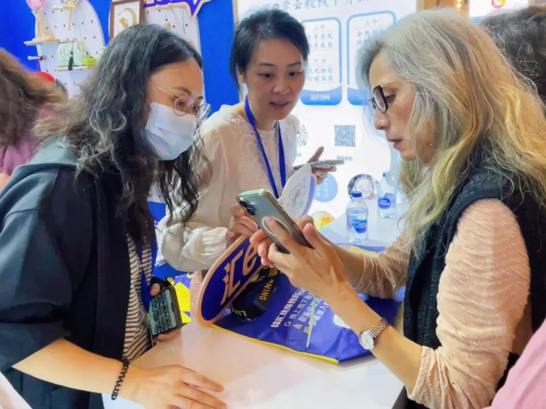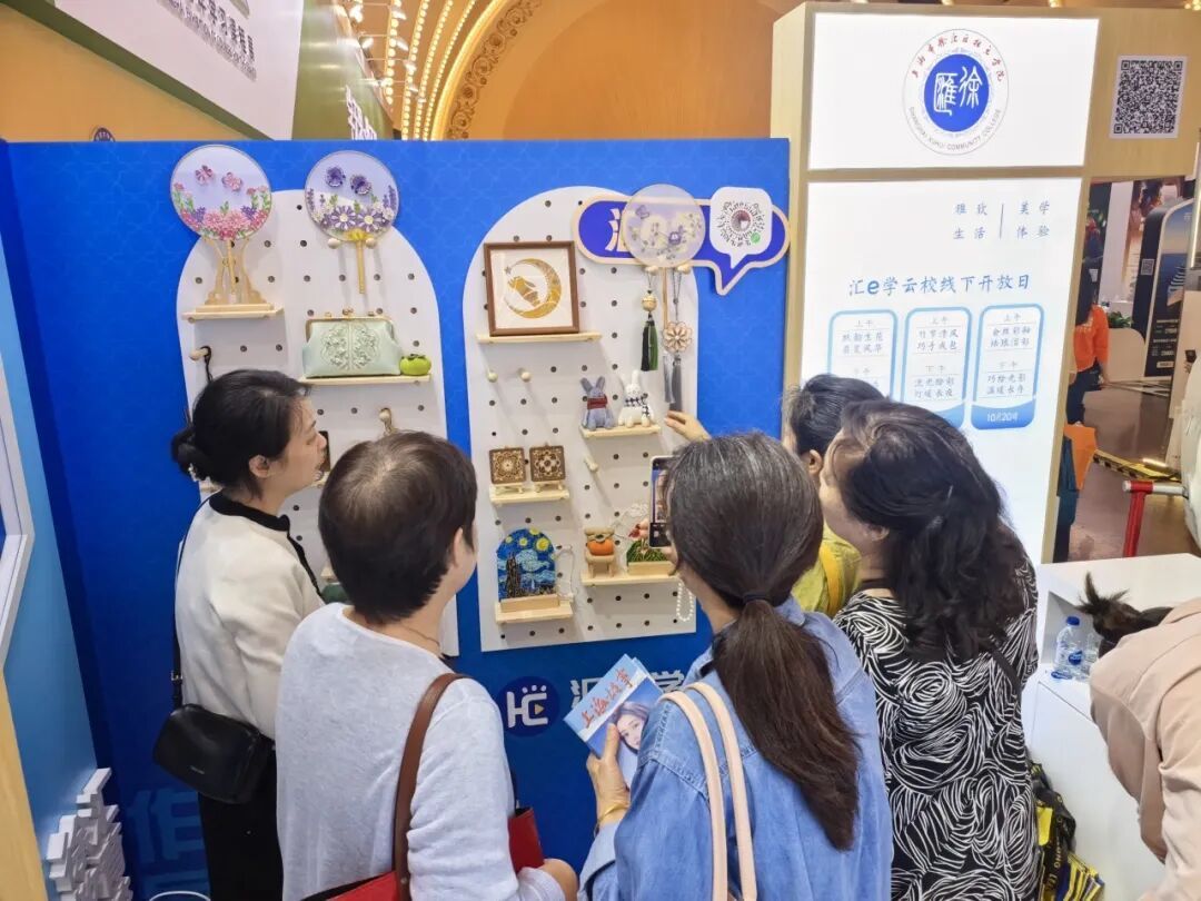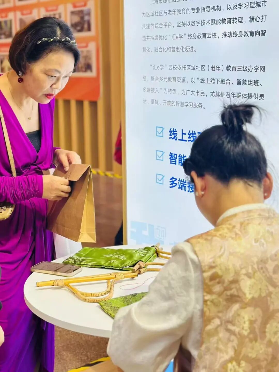 在三天展期内,徐汇展区分时段推出“汇e学云校开放日”微课程现场手作体验。衍纸扇、竹节包、玻璃画、珐琅彩杯垫、生活花艺等课程,将传统文化与现代生活美学完美融合,学员们不仅在现场观摩学习,还领取了相关的学习体验包,回家通过“云课”继续练习,实现“线下体验、线上深化”的融合学习。