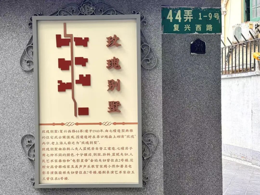 玫瑰别墅建于1940年,位于复兴西路44弄,由七幢造型典雅的住宅式公寓组成。整个建筑群占地4393平方米,建筑面积3175平方米,由三家设计公司协同完成。因建造时弄口地面砌有“玫瑰”二字,故被老上海人亲切地称为“玫瑰别墅”。该建筑群原为孙科二夫人蓝妮亲自督造,后收归国有,转为地方民居。
