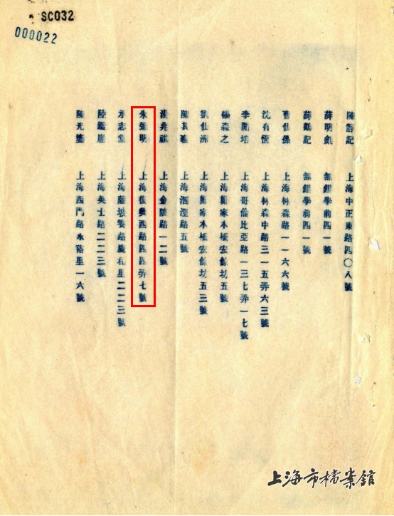 《联丰花纱布股份有限公司章程》第42条“本公司发起人姓名住址”内有写明“朱弥明 上海复兴西路四四弄七号”(来源:上海市档案馆)