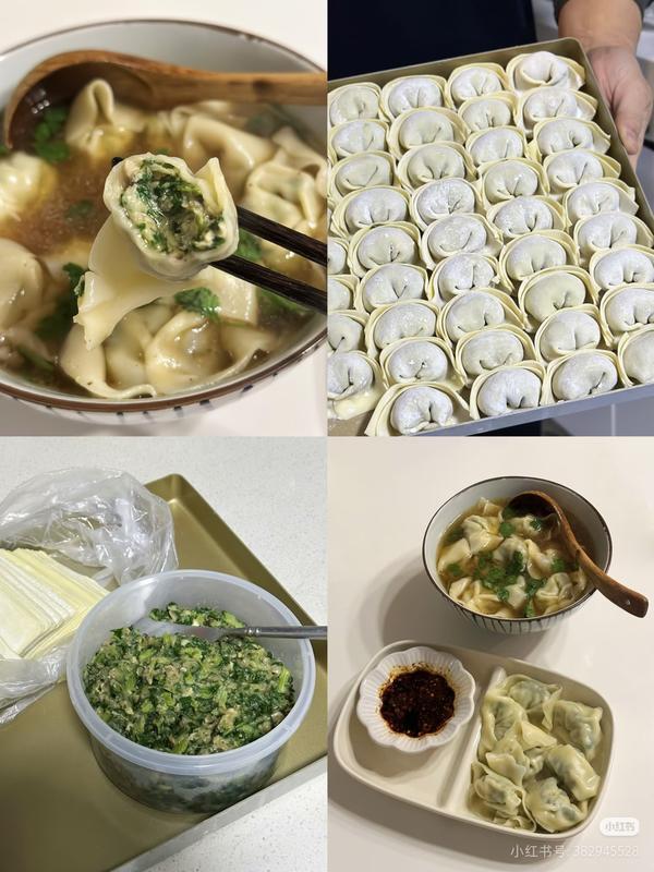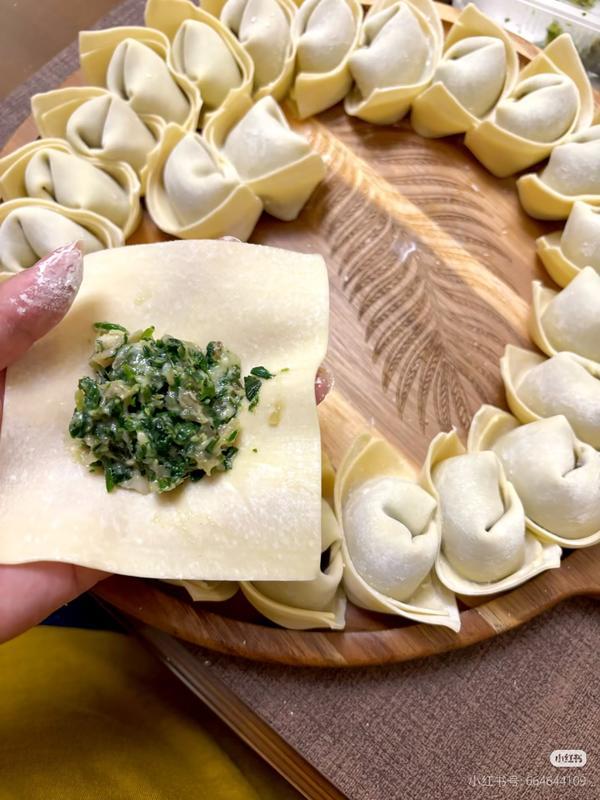 这家卖得最好的当数荠菜汤馄饨,馅料里那星星点点的绿色,其实不光是荠菜,还有少量鸡毛菜, 混合着肥瘦相间的猪肉,不仅可以增强口感,也能均衡馅料的湿度。