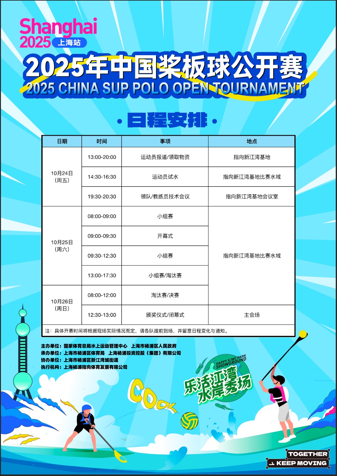 在杨浦新江湾城文体公园,一场代表速度、技巧与团队协作巅峰对决的水上盛宴——2025年中国桨板球公开赛(上海站),将于10月25日至26日激情上演!这不仅是一场国家级的高水平竞技赛事,更是一次汇聚全国水上运动精英,展示杨浦城市活力与生态魅力的盛大聚会。