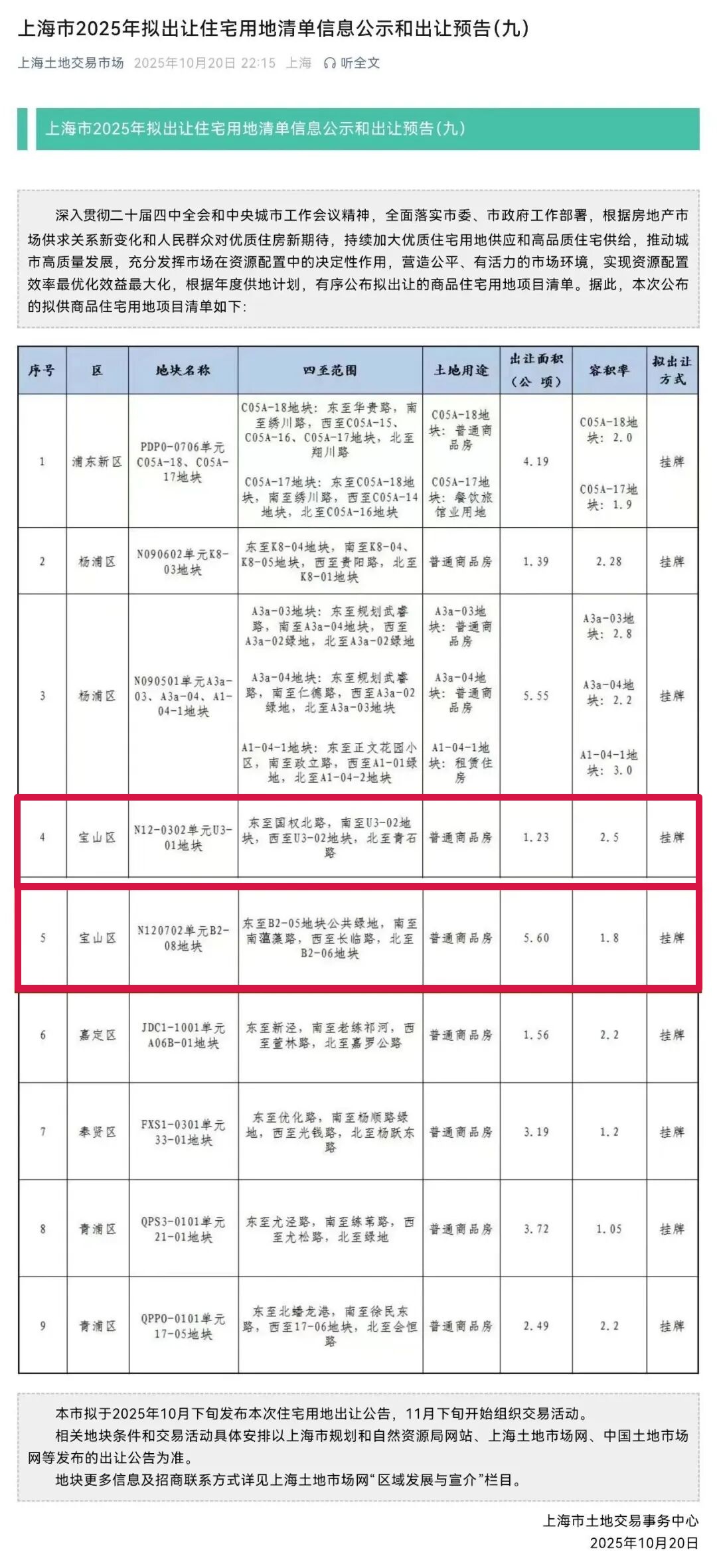本批次共涉及6个区共9幅涉住地块,其中宝山区有2幅地块。具体信息如下: