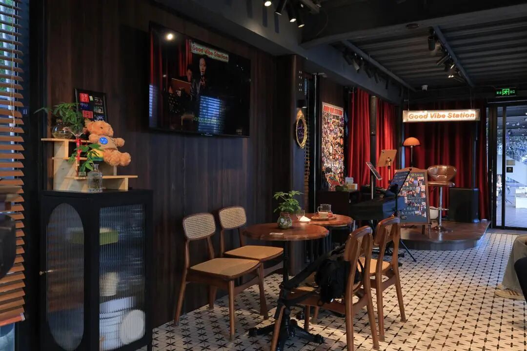 周末的傍晚,晚霞为杨浦滨江镀上了一层金色,好气咖啡Good Vibe Station通透的玻璃窗里已亮起暖光。走进店里,主理人陈文哲已调试好吉他,歌手们在整理乐谱,贴着“预留”标签的桌前,咖啡香、酒香与期待感一同升腾。