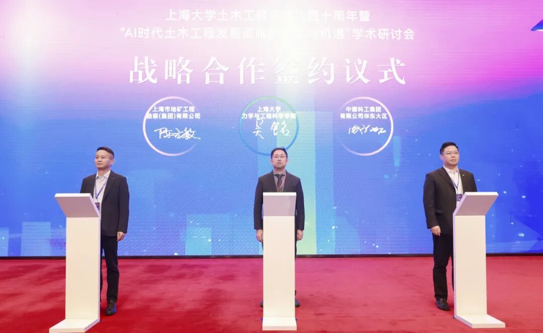 上海市地矿工程勘察(集团)有限公司总经理陈方敏,中建科工华东大区党委书记、董事长成能名,力学与工程科学学院党委书记吴铭共同签订战略合作协议。