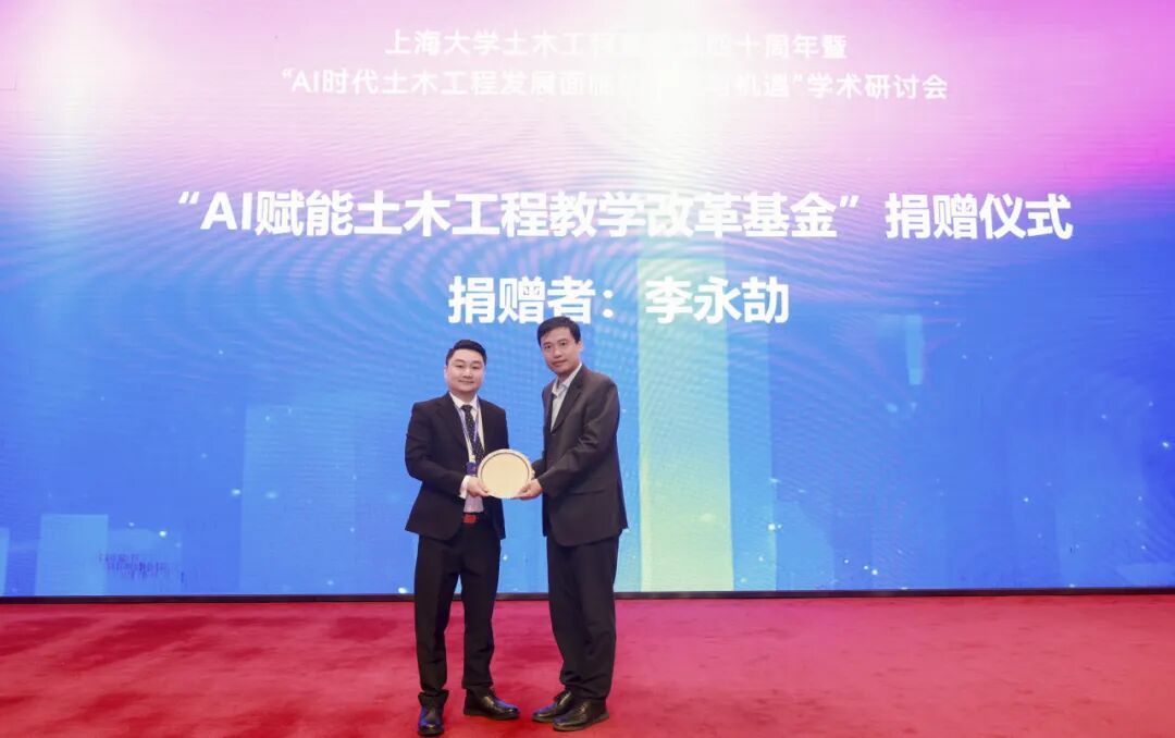 李永劼先生个人捐赠人民币两百万元,成立“AI赋能土木工程教学改革基金”。上海大学党委副书记、副校长胡大伟向李永劼先生颁发捐赠纪念牌。李永劼表示,人工智能与传统土木工程的深度融合,是未来工程领域发展的必然趋势。他希望该基金能助力土木工程系在AI+土木工程领域培养更多优秀的工程人才,为推动行业进步贡献力量。