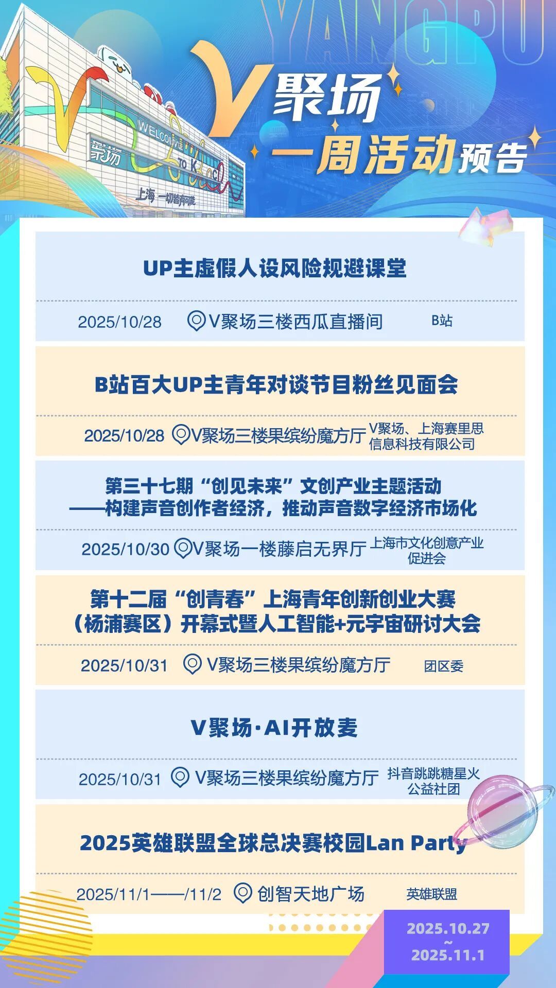 与千万粉丝“UP主”面对面互动,和B站、抖音、小红书等互联网大厂座谈交流,与AI领域创始人探讨人工智能发展新趋势……在杨浦V聚场,随时都有最前沿活动等你来打卡。无论你是互联网从业者,还是创意玩家……这里都将成为你迸发灵感的“能量场”。V聚场10月27日-11月2日一周活动预告来啦!快来碰撞灵感~