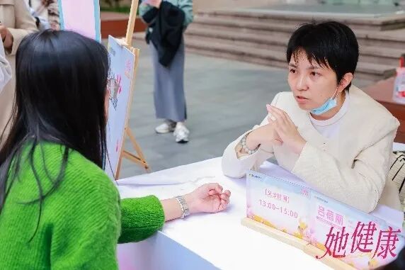 本次活动特邀上海市女医师协会的两位专家现场坐诊,为师生提供一对一健康咨询。义诊区前排起了长队,医生们耐心细致的解答,赢得了大家的一致好评。一位老师分享道:“两位医生非常专业,解答了我很多困惑,省去了专门去医院的时间,真的很暖心!”