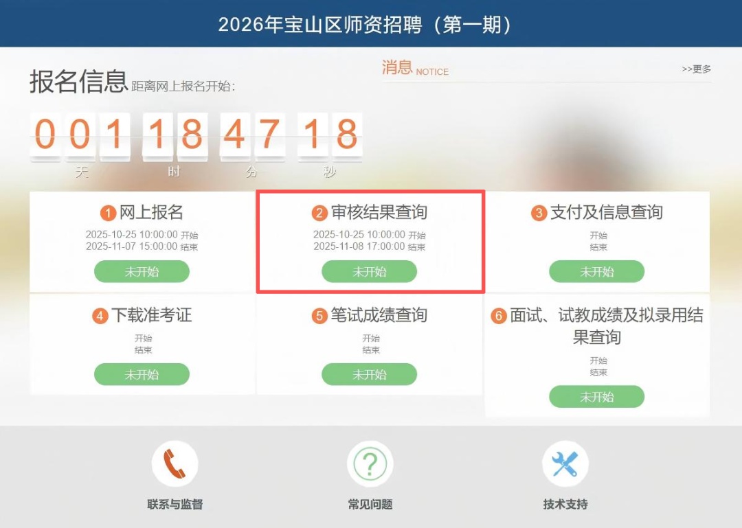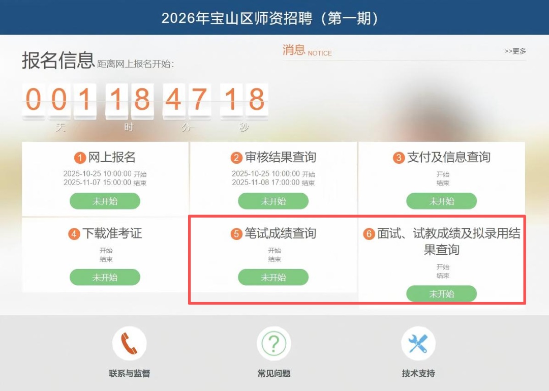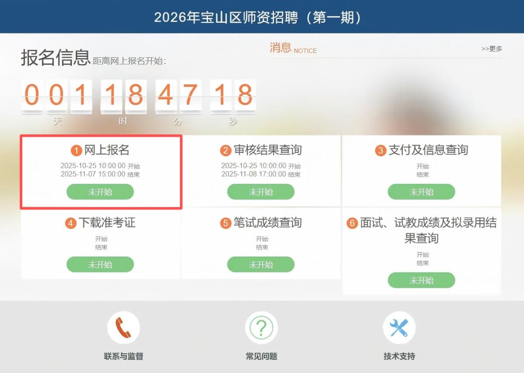 近年来,随着宝山人口导入 教育规模持续扩大 亟需招录、引进和培养一支 “高素质专业化创新型”的教师队伍 为打造“陶行知教育创新发展区” 提供人力资源保障 流程时间安排 2026年宝山区 教师招聘(第一期)报名工作 网上报名时间: 10月25日10:00—11月7日15:00 支付及信息查询时间: 11月9日10:00—11月13日15:00 (如有变化以平台公布时间为准) 学科测试时间: 11月29日9:00—11:00 复制以下网址,打开浏览器粘贴 或点击“阅读原文”可进入 http://bsszzp.bsedu.org.cn/website/online/exam_list.zul 宝山区教师招聘报名流程 步骤一 进入宝山区教师招聘平台 点击“网上报名” 即可进行线上注册 填报个人信息 选择学校具体岗位报名 步骤二 扫码关注技术支持公众号 届时会点对点推送后续的各类通知 (报名考试招聘期间请不要取消关注公众号) 步骤三 学校对应聘人员进行审核 应聘人员可通过平台查询结果 步骤四 学校审核通过的人员 在网上支付笔试费用 (支持微信扫码支付) 步骤五 应聘人员打印准考证 参加笔试 (学科测试、综合测试) 步骤六 应聘人员可通过平台 查询笔试、面试、试教成绩 以及拟录用结果 宝山区师资招聘岗位信息