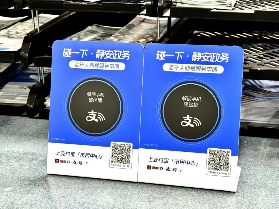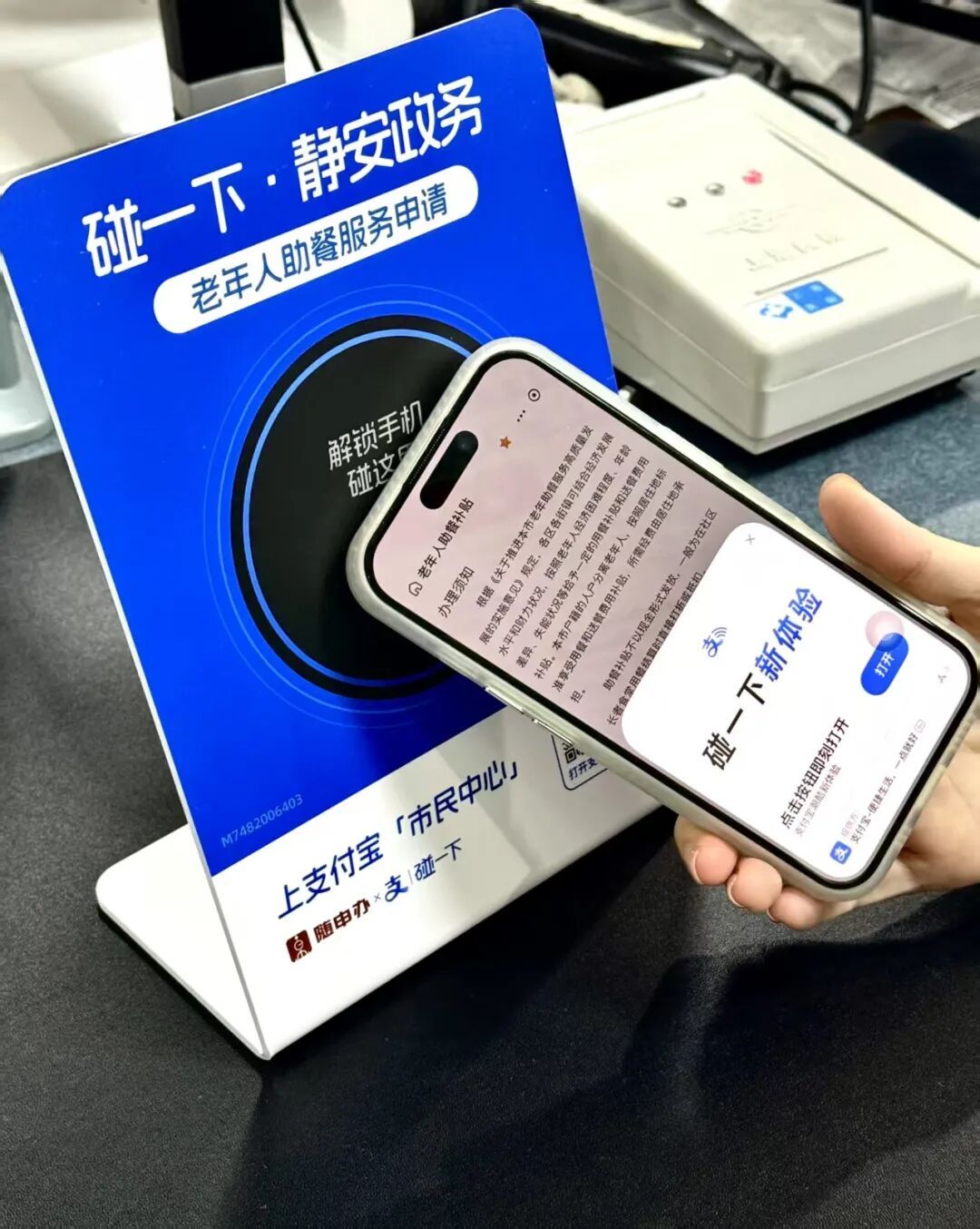 这意味着,从今日起,需要申请助餐补贴的居民们不用再大排长龙,在窗口等待人工受理,只需使用具备NFC功能的手机在小小的台卡上轻轻一碰,即可直达“随申办”支付宝小程序的老年助餐服务申请入口。