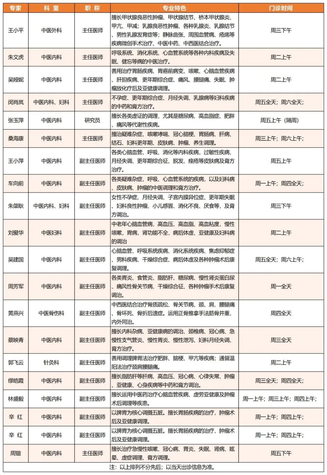 注:姓名后标记*者为国医大师、市级及以上名中医;门诊时间后“△”表示单独开设的膏方门诊。排班表仅供参考,具体时间以当日安排为准。