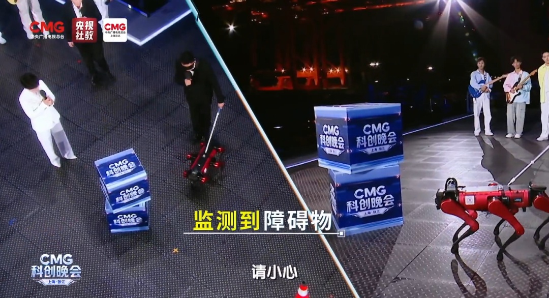 紧接着,上海交通大学展示了其在机器人稳定性与专用功能上的突破。一台名为“小交”的六足智能机器人稳步走向舞台中央,其设计者高峰老师介绍:“她就像人类一样灵敏,拥有敏捷的视觉、听觉和触觉,能带领盲人出行。”为验证其能力,现场设置了障碍通道,在蒙住双眼的体验者完全信任的跟随下,“小交”凭借其卓越的环境感知能力,多次发出“前方有障碍物,请小心”的预警,成功完成导引。