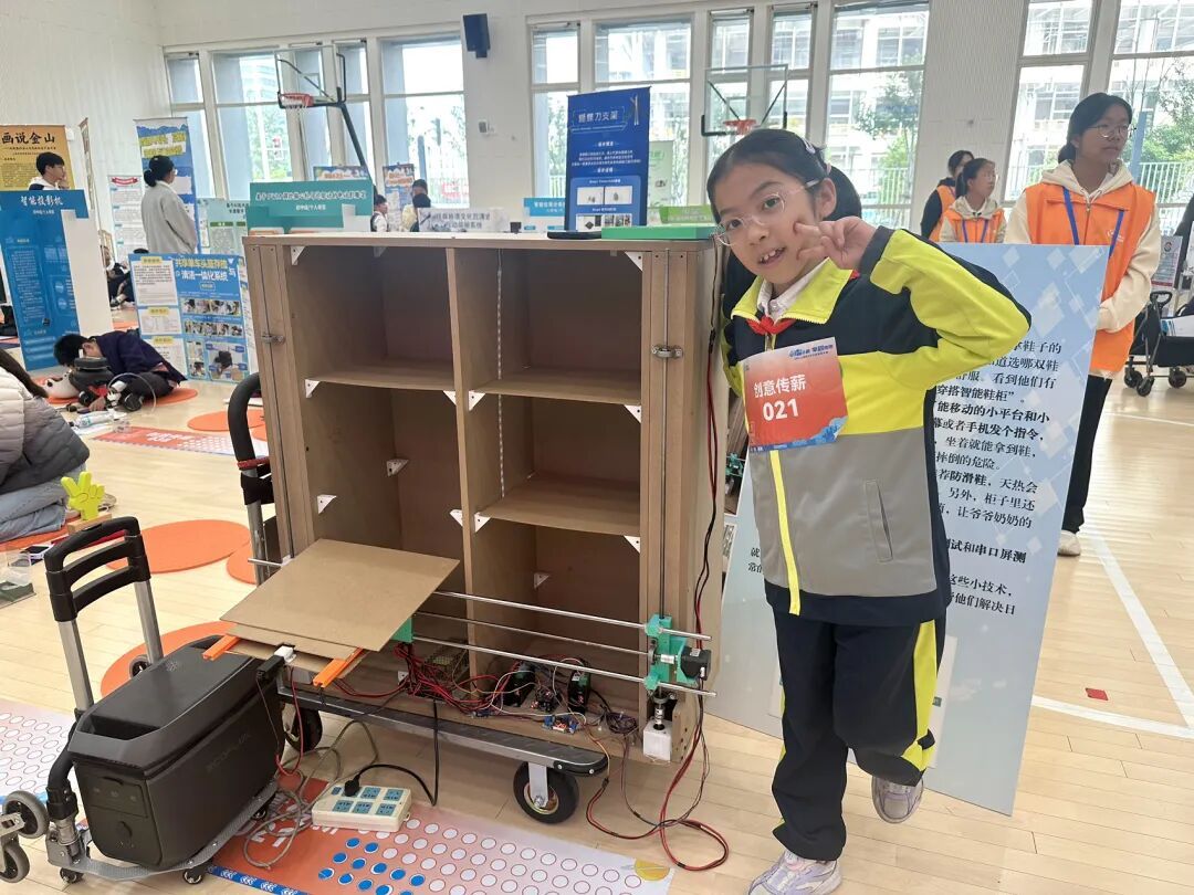 “这是我为老年人开发的智能鞋柜,只要在手机App上给出指令,它就能传递出想穿的鞋子,这样一来爷爷奶奶就不用弯腰找鞋啦!”杨浦区二联小学学生糜悦泽向第一教育演示起了她的小发明。