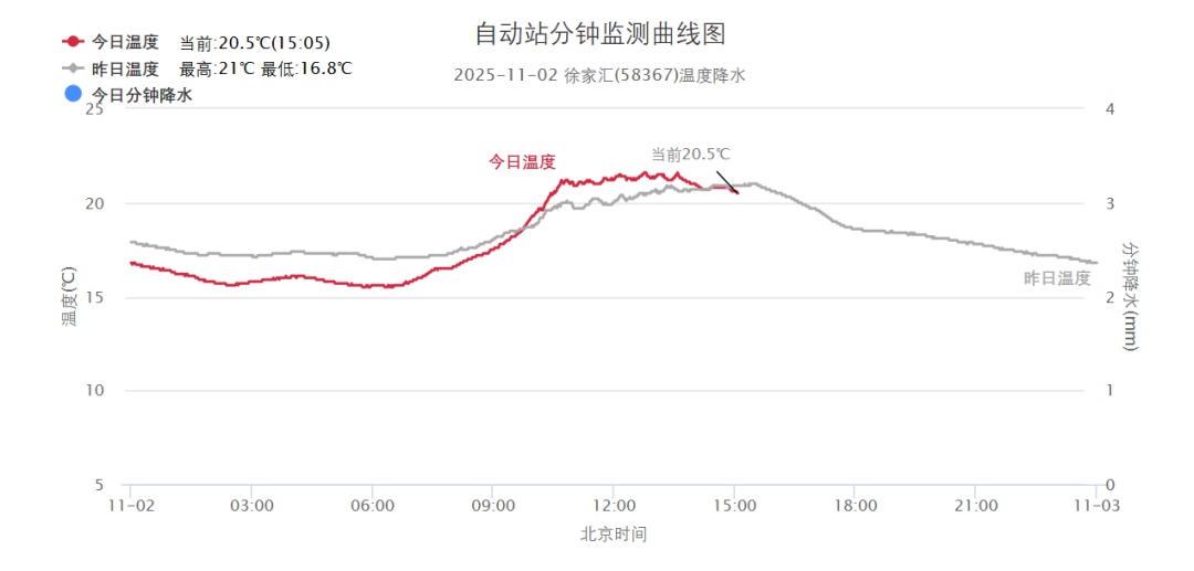 今天早间瑟瑟秋凉,白天稳步升温,全市最高气温普遍21~23℃,徐家汇站21.6℃。