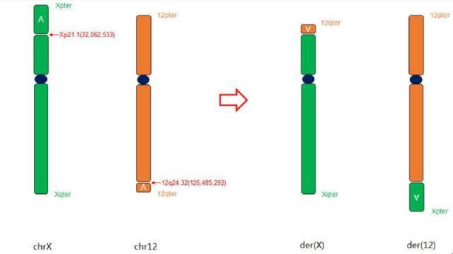 为了破解谜题,肖园医生团队给甜甜做了染色体核型分析,她的一条X染色体和一条12号染色体发生了“错位”:X 染色体短臂(p21.1区域)的一段,和12号染色体长臂(q24.32区域)的一段 “交换了位置”,这种情况在医学上叫染色体平衡易位。为了精准确认,医生又安排了更先进的光学基因组图谱(OGM)检测。如果说染色体核型分析是“拍全身照”,OGM就是“高清CT”,能精准定位染色体上的每一个“断点”。检测结果证实了猜想:甜甜X染色体的断裂点,恰好位于DMD基因的第44号内含子区域。这就像一条“基因项链”被拦腰剪断,导致DMD基因无法正常工作,自然无法合成“肌营养不良蛋白”。