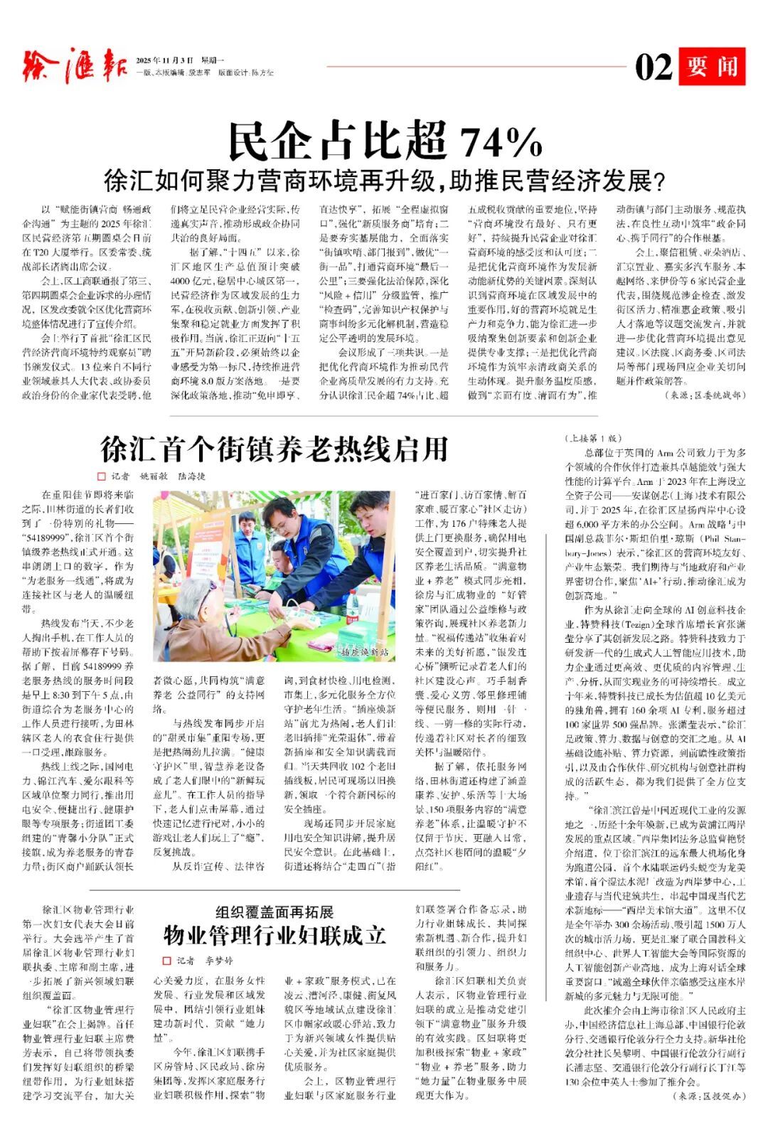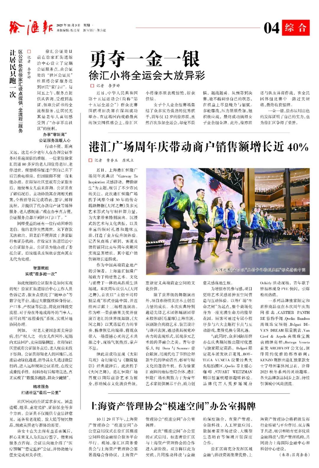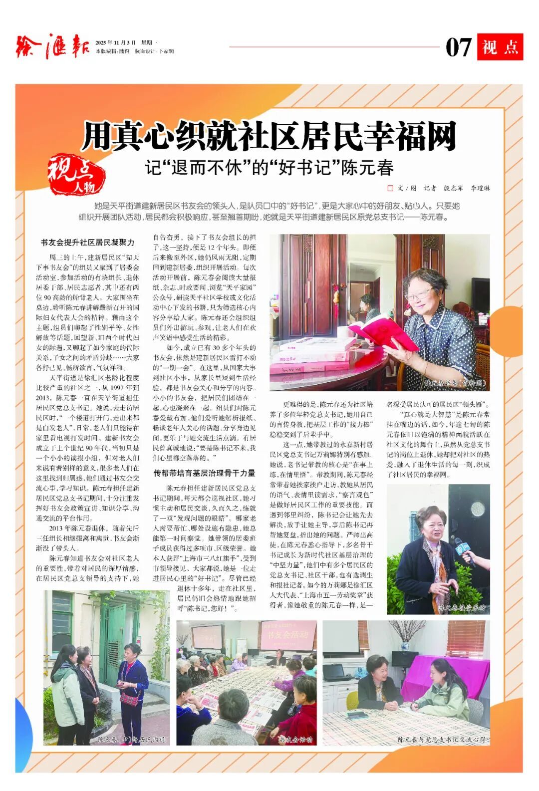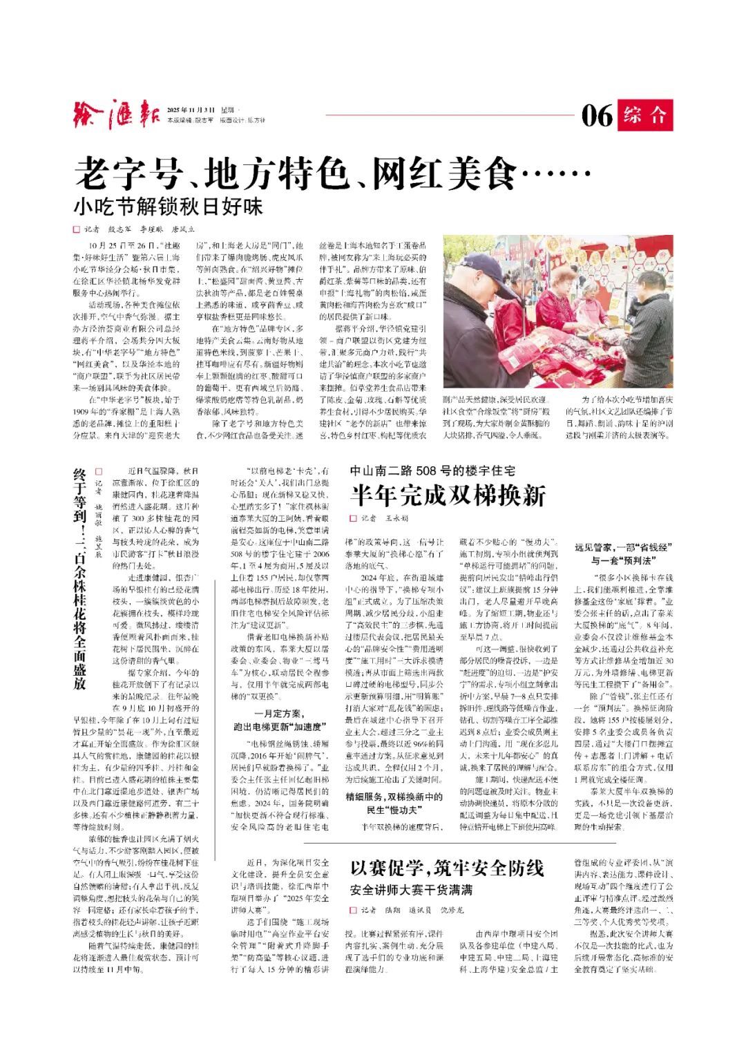 徐汇首个街镇养老热线启用 在重阳佳节之际,田林街道推出养老热线54189999,为长者提供“一口受理”式服务。田林街道联合多方力量,提供用电安全、出行保障等专项服务,并以“插座焕新站”等实事项目守护老人安全。这一涵盖十大场景、150项服务内容的“满意养老体系”,筑牢社区与老人的温情纽带,让54189999一一“我事要拨,九九·久久”深入人心。 港汇广场周年庆 带动商户销售额增长近40% 上海港汇恒隆广场周年庆火热启幕,带动商户销售额强势增长近40%。风靡世界的踢踏舞《大河之舞》重磅登场,与蛹剧团《毛星球》等本土创意碰撞出全新艺术火花。多元艺术激情上演,国际名牌限时优惠,全城焦点在此交织、汇聚。“灵感律动 舞韵新生”,已为城市潮流烙下深刻印痕。 老字号、地方特色、网红美食…… “社趣集·好味好生活”暨第六届上海小吃节华泾分会场活动,近日在华泾镇北杨华发党群服务中心举行。空气中香气漫溢:“老字号”乔家栅糕点等飘香百年;“地方特色”食品风味诱人;“网红美食”迷丝卷等创意十足;“商铺联盟”的现炸猪排香气暖巷。党建引领似春风,将多元滋味揉进生活,让幸福馨香萦绕社区烟火间。 用真心织就社区居民幸福网 她组织建新书友会凝聚邻里,退休十二载仍坚持带领读报学习,用知识与温暖聚起人心。她精选时政要闻、传播党的政策,带领居民学习新知识、践行社区新风尚。她更倾力传帮带,为社区培养新生骨干,把奉献精神代代相传。她就是建新居民区原党总支书记——陈元春,一位“退而不休”的“好书记”。 星辰为证,解码硬核浪漫 两千多年前有《天问》,在太空中如何凝望来处?《窗外是蓝星》这部太空影片用镜头诠释了原来家园是无垠黑暗中目前唯一的光亮。“星星真的摘得下来吗?”影片以神舟之旅揭示:星星不必摘——它是我们文明最温暖的起点与归宿。这是一场人类与宇宙的对望,更是一次心灵的归乡。
