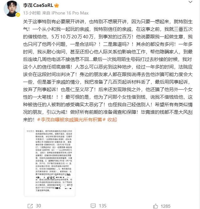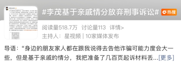 李茂称,自己曾三番五次借钱给该亲戚,从五万、十万到事发时的过百万。他自称虽掌握数百页刑事诈骗证据,朋友和家人也都建议他以诈骗罪报案,但基于亲戚情分最后放弃了刑事诉讼,改为民事起诉。