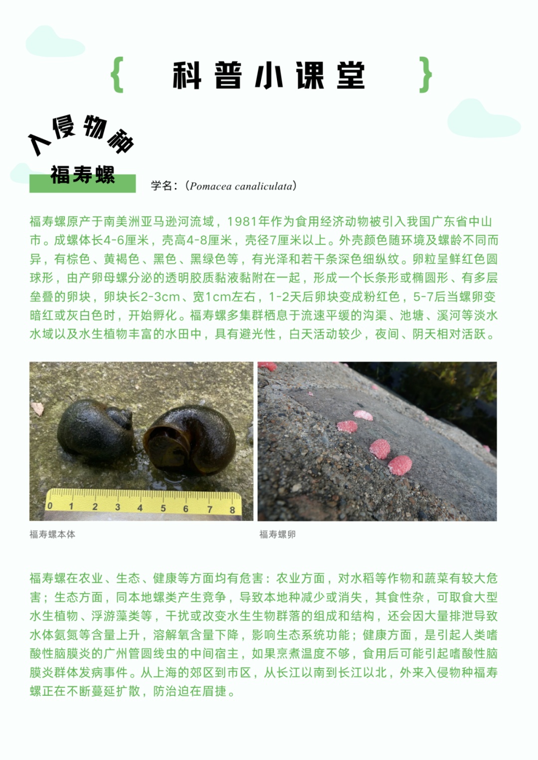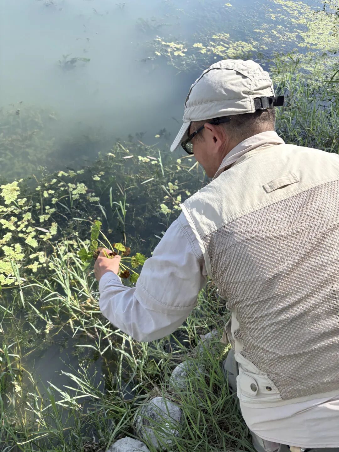 第二场活动开展清理福寿螺,大家手持钳子、捞网等工具,沿着河道、池塘岸边仔细搜寻,不放过任何一个福寿螺卵块和成螺。过程中,姜龙老师还现场讲解福寿螺的危害、识别方法及防治知识,提升了参与者的生态保护意识。