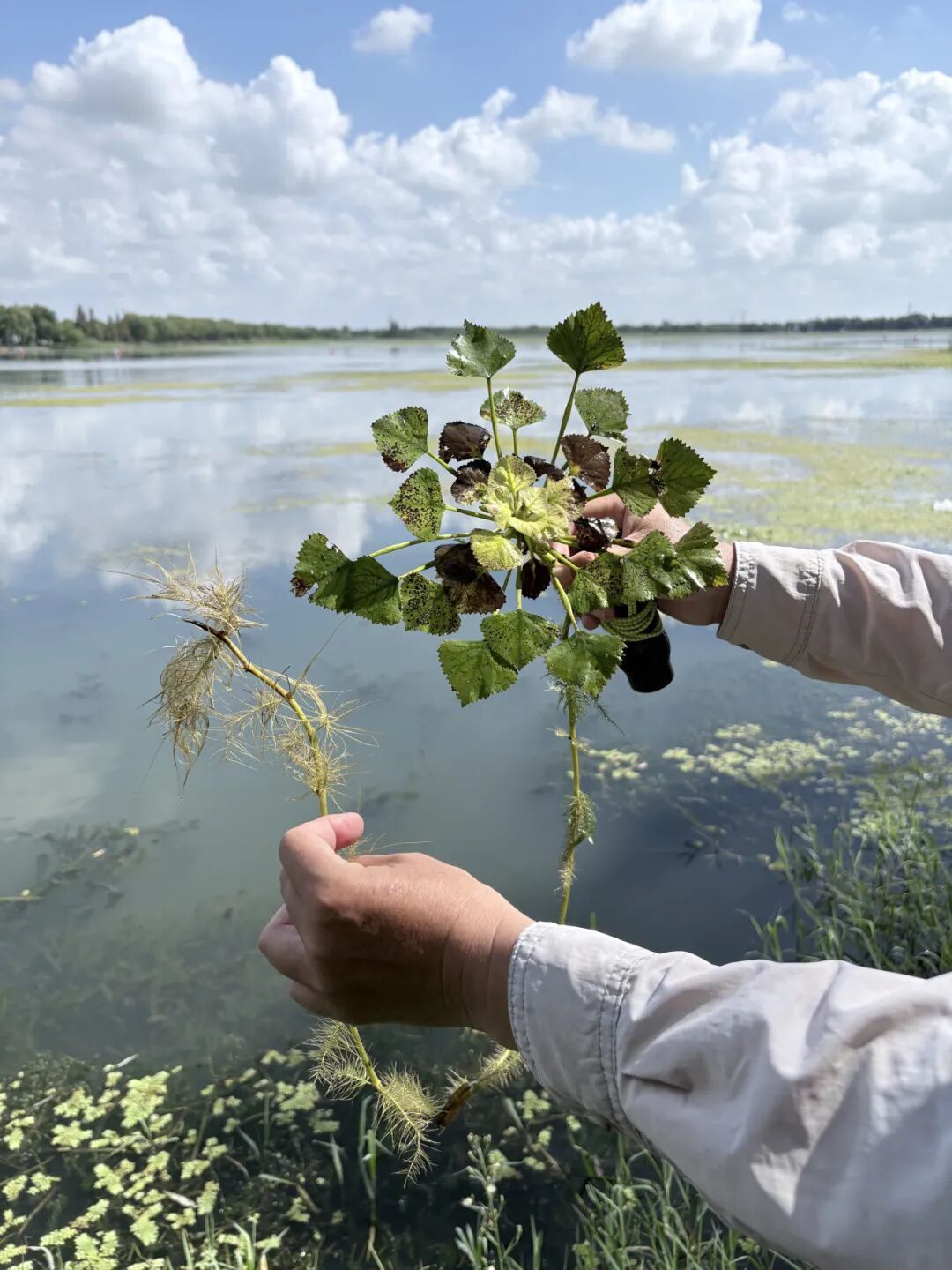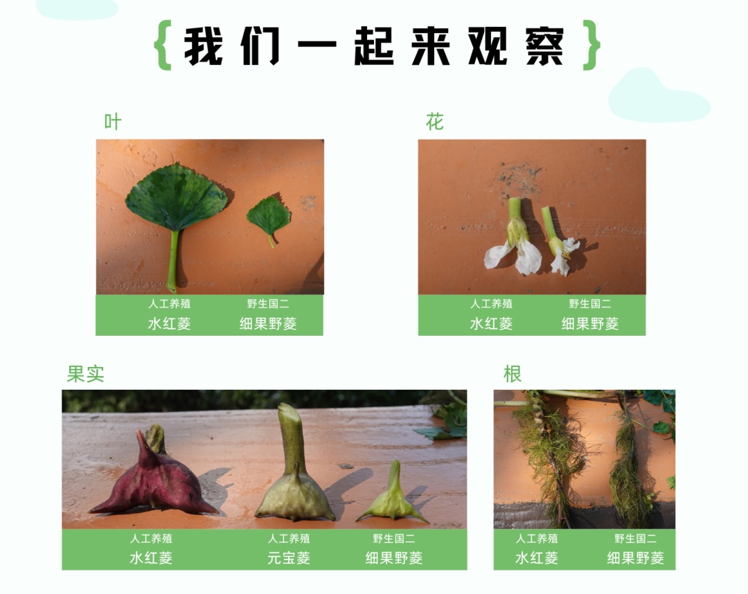 体验过采菱的乐趣后,大家也好奇起人工养殖菱角和野菱角的区别,在大莲湖附近寻找起野菱角,发现几株细果野菱(国家二级重点保护野生植物)。