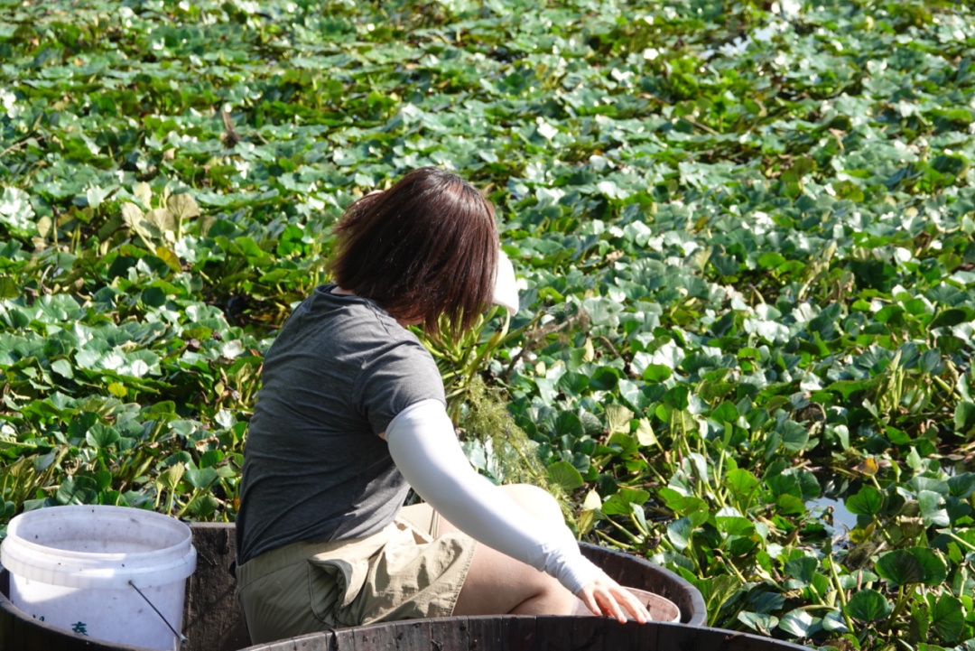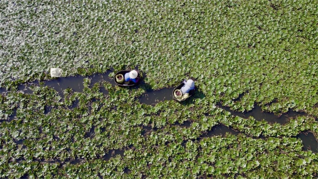 活动当天,晨光洒向菱角塘,阿婆和阿公坐在木桶里娴熟采菱 —— 阿婆指尖穿梭拨叶、捏根轻提,阿公稳桶前倾够取,水珠随菱角滴落;有参与者体验了一把采菱角乐趣,大家也品尝了刚刚采上来的菱角。