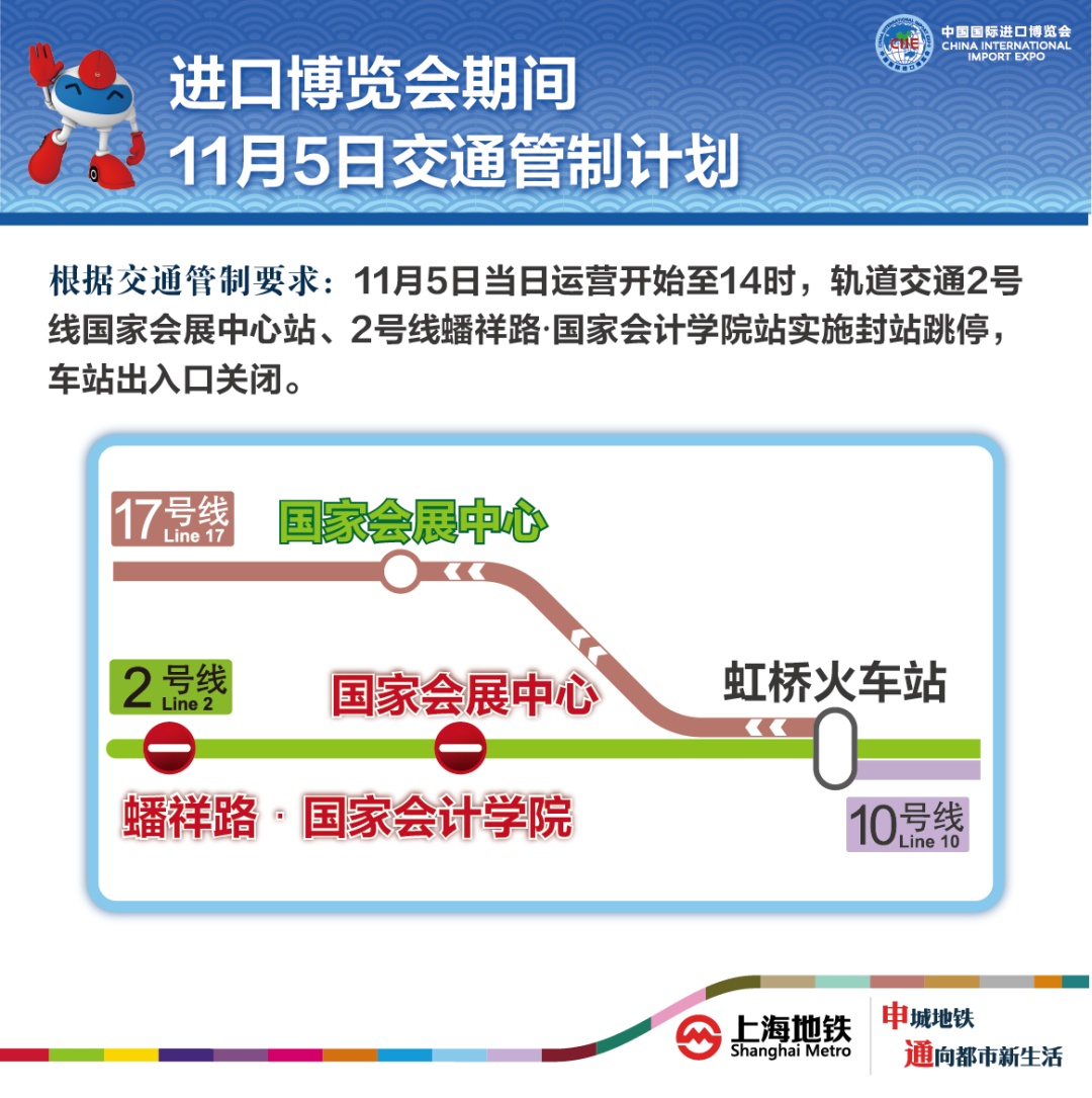 此外,11月5日当日运营开始至14时,轨道交通2号线国家会展中心站、2号线蟠祥路·国家会计学院站实施封站跳停,车站出入口关闭。需前往国家会展中心的乘客可到17号线国家会展中心站下车。详见↓