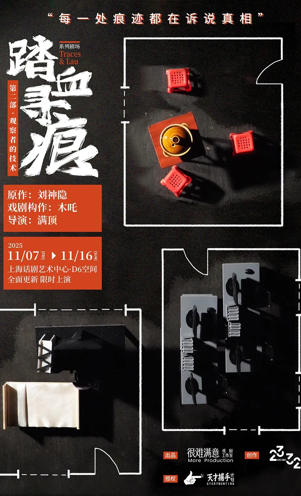 当胶带封死的密室里传来第二人的呼吸,当烧炭自杀的现场丢失了关键电脑——11月7日至16日,犯罪推理系列剧场《踏血寻痕》第二部《观察者的技术》将登陆上海话剧艺术中心·D6空间,以“痕检师视角+极简舞台+时代命题”的三重魅力,延续该系列大麦9.0、猫眼9.6的高口碑,邀观众沉浸式剖开完美犯罪的伪装。