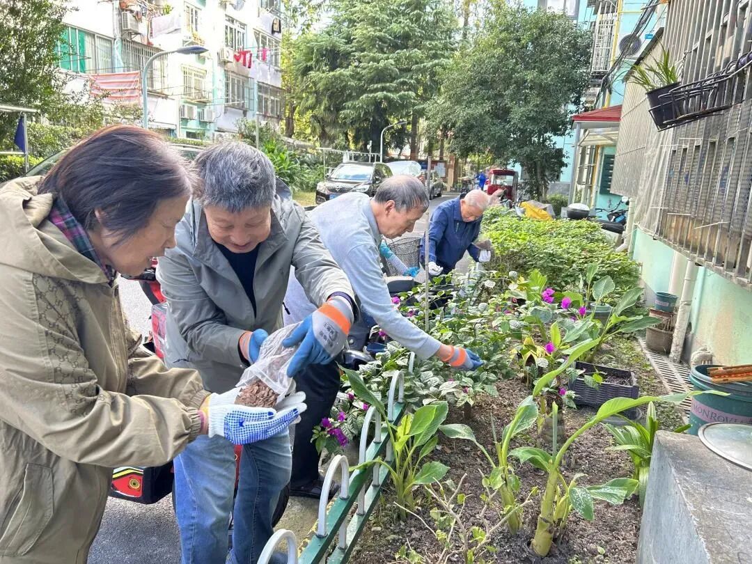整改行动开展当天,居民区党总支书记来到现场,再次向参与人员和周边居民重申小区绿化管理的禁止事项,进一步强化大家的公共规则意识。随后,紫薇园第二党支部党员、居委会干部、物业绿化工与居民志愿者迅速形成合力,分工协作推进整改:一方面对绿化带内零散摆放的盆栽进行集中筛选,将耐寒、适应当地气候且适合室外生长的植株统一移植入地;另一方面,对不耐寒、不适合室外长期生长的盆栽,协助居民妥善移回家中养护。此外,针对5号楼转角处长期裸露的“斑秃”区域,大家共同开展补植修复工作,确保整改覆盖所有问题区域,不留死角。