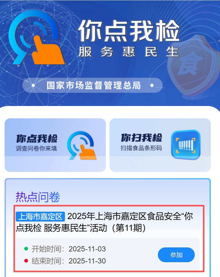 民以食为天,食以安为先。为守护您“舌尖上的安全”,2025 年上海市嘉定区食品安全 “你点我检 服务惠民生” 活动第11期开启!
