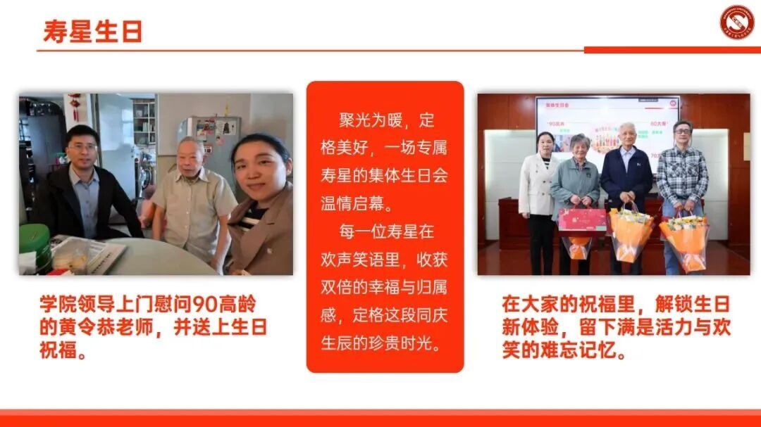 重阳同贺寿 岁月忆荣光 从风华正茂到鬓角飞霜,不变的是初心使命。一生热爱,一生坚守,“回娘家”的活动不仅让离退休教师们深切感受到了来自学校的关怀与温暖,更为学校传承优良传统、激发教育创新活力注入了新的源泉。 为“逢五逢十”生日老同志举办集体祝寿活动,大家围坐一起共唱生日歌、畅谈往昔岁月、回忆美好时光。聚光为暖,定格美好,一场场专属寿星的集体生日会温情启幕。每一位寿星在欢声笑语里,收获双倍的幸福与归属感,定格这段同庆生辰的珍贵时光。 法学院 环境与化学工程学院 计算机工程与科学学院 机电工程与自动化学院