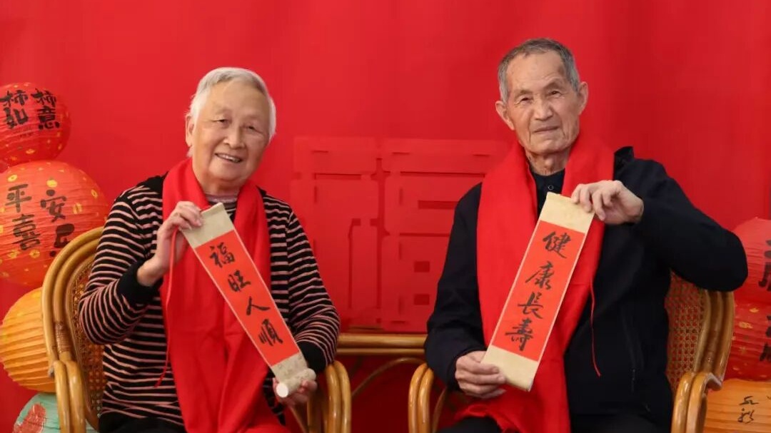 活动现场,“福寿安康”主题背景板格外醒目,周围陈列的福字摆件、大红围巾、手捧花等各式道具,都是根据老人们的喜好提前挑选,共同渲染出一派喜庆祥和的气象。