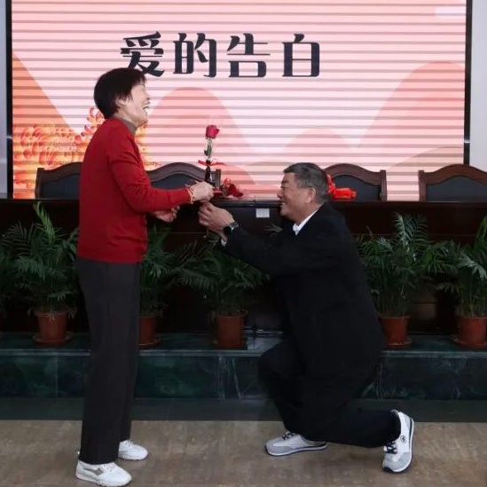 随后,“爱的告白”环节真挚感人,将现场气氛一次次推向高潮。在主持人的引导下,叔叔阿姨们共同回忆了生活中的点滴趣事。叔叔们拿起玫瑰花,在温馨音乐中动情表达:有的眼含泪花,深情注视老伴;有的更是用“单膝跪地”献上玫瑰,重现年少激情。一句朴素的“辛苦了”“谢谢你”,或一个紧紧的拥抱,都成为此刻最动人的告白。摄影师迅速抓拍,将这些真挚的瞬间一一留存。