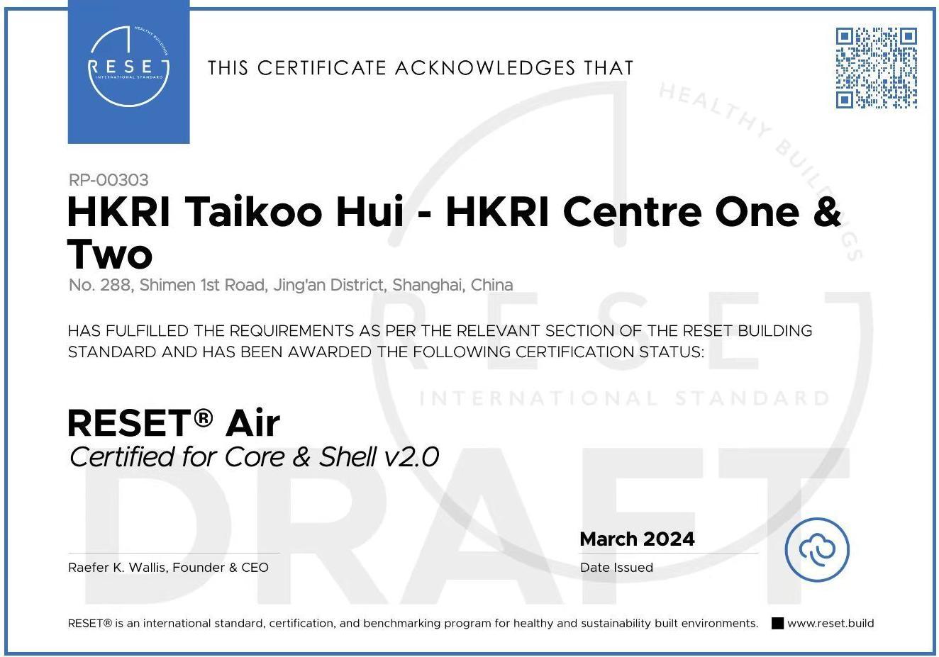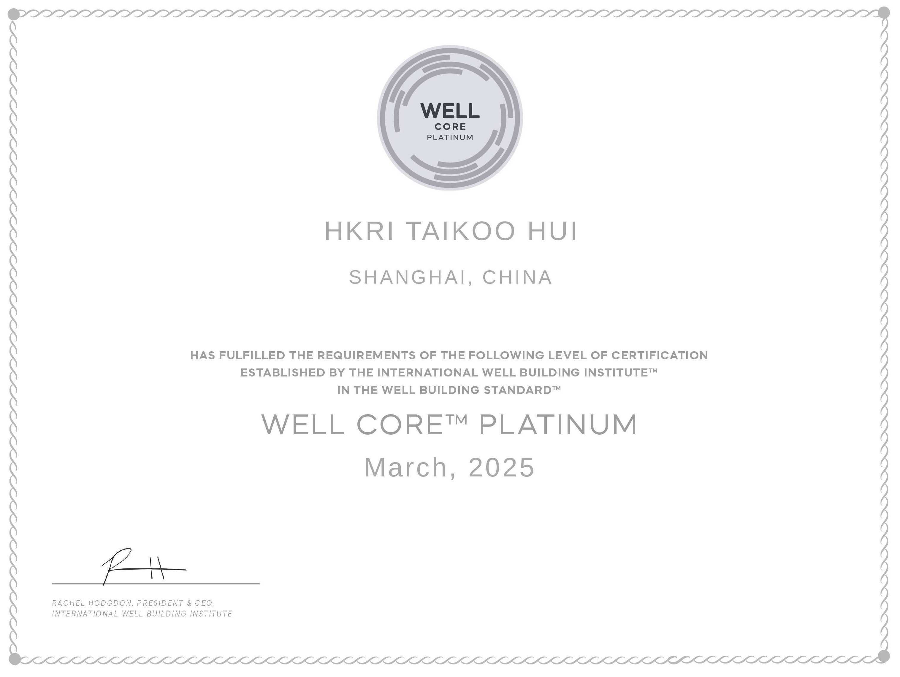 目前,项目已获得LEED®、WELL™、RESET™ Air等多项绿色建筑认证,其中,2025年3月新获的WELL健康建筑标准™(WELL Building Standard™)核心铂金认证为最高级别认证,彰显其在健康建筑与高效运营方面的领先地位。