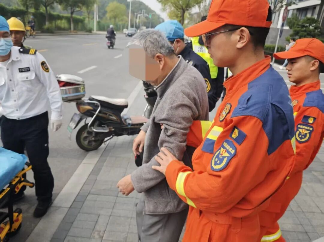 了解情况后,三人立即分工展开救援:一人在来车方向引导车辆减速避让,防止二次事故发生;一人配合到场交通协管员检查两车驾乘人员情况。另一名队员则协助现场交通协管员,将老人转移至路边安全区域并询问其身体状况,小心安抚其情绪。五分钟后,120救护车抵达现场。消防员们配合医护人员将伤者送上救护车,随后等待警察到场。直至事故处理完毕、道路恢复通行,才重新驾车继续执行巡逻任务。