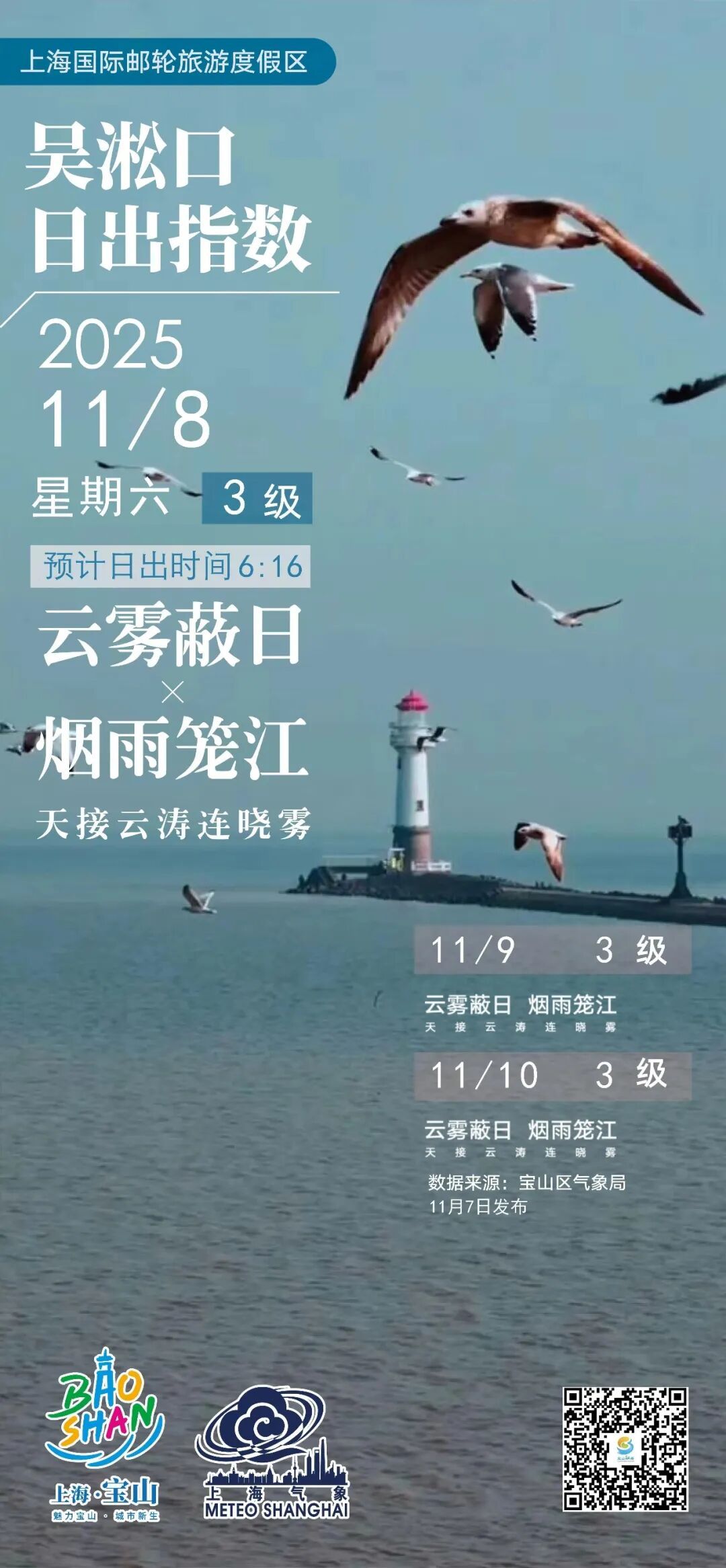 【吴淞口日出指数】11月8日3级 云雾蔽日×烟雨笼江