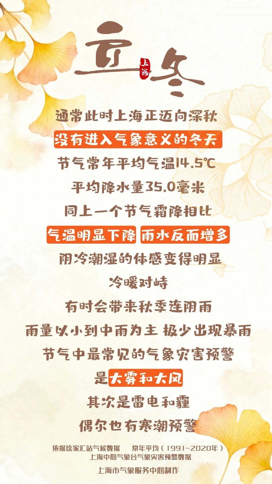 今日进入“立冬”节气,通常此时上海正迈向深秋,还没有进入气象意义上的冬天。相比上一个节气“霜降”,气温明显下降,雨水反而增多,阴冷潮湿的体感变得明显。